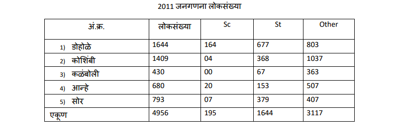 2011 च्या जनगणनेनुसार ग्रामपंचायतीची एकूण लोकसंख्या 4956 आहे. विविध गावांमध्ये लोकसंख्या व कुटुंब संख्या वेगवेगळी असून डोहोळे गावात सर्वाधिक लोकसंख्या आढळते.