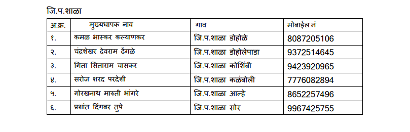 जि.प. शाळा व मुख्याध्यापक संपर्क तपशील”