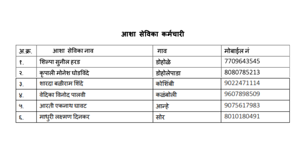 गावनिहाय आशा सेविका व संपर्क तपशील”